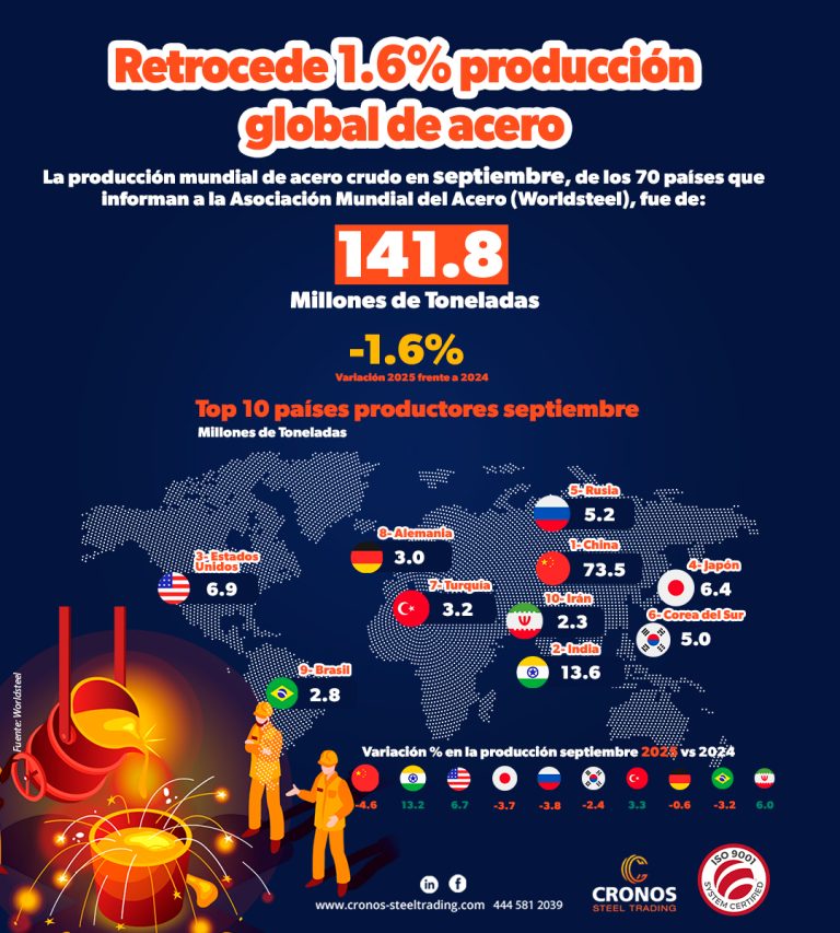 Una combinación de factores como las barreras comerciales a China, los aumentos en aranceles al acero y aluminio por parte de la Unión Europea y Estados Unidos contribuyó a que la producción global de acero cayera aproximadamente 1.6 % en septiembre de 2025, siendo China responsable de la mayor parte del descenso, con una reducción estimada del 4-5 %.